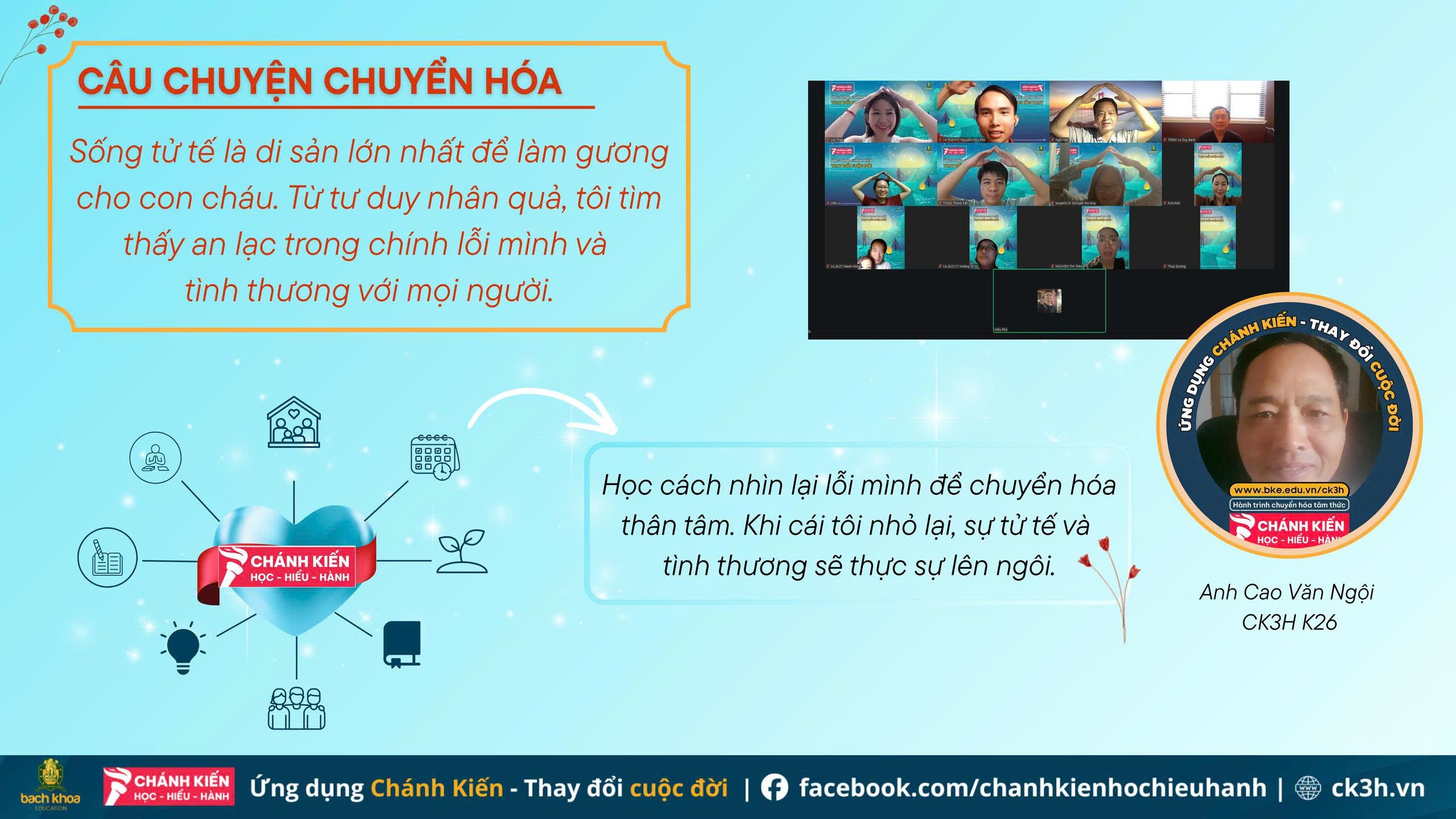 VỀ NHÀ Chào mừng huynh đệ khắp gần xa,Chánh kiến mở ra, ta “Về nhà”.Tỉnh thức an nhiên trong mỗi phút,Buông thư nhẹ gánh mọi âu lo.Lời lành trao gửi, tâm trong sáng,Bước vững trên đường, trí nở hoa.Kết nối yêu thương, tình rộng mở,An lạc thênh thang, chẳng nghĩ xa Tác giả: Vân Long…