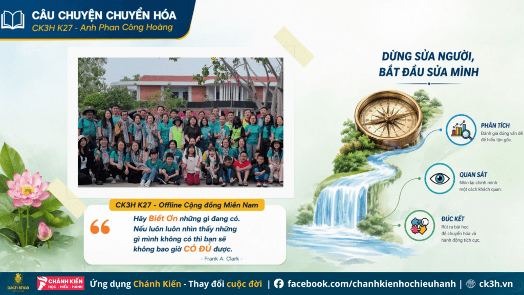 Câu chuyện chuyển hóa tại Chánh Kiến Học – Hiểu – Hành, viết lên bởi cư dân CK3H K27, anh Phan Công Hoàng, sưu tầm bài chia sẻ cảm nhận cuối khóa học trên Facebook Cộng Đồng: