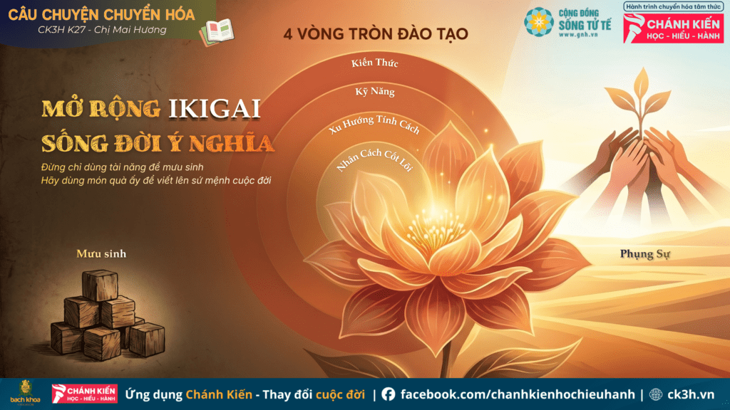 Bài học ý nghĩa nhất đối với mình trong CK3H chính là bài học về 4 vòng tròn đào tạo, giúp mình nhìn rõ ikigai và sứ mệnh cuộc đời của bản thân hơn. Trước đây mình cũng biết bản thân có năng lực, sở trường gì nhưng mãi chưa bứt phá được vì dường như mình chỉ muốn dùng năng lực, sở trường ấy để mưu sinh thay vì làm những điều lớn lao, ý nghĩa hơn. Bài học đã giúp mình nhận diện ra vấn đề của bản thân: thiếu động lực vì chưa dám làm những điều ý nghĩa hơn vì người khác. Điều này khiến mình thay đổi góc nhìn để mở rộng ikigai thành một mục tiêu lâu dài và lớn lao hơn.