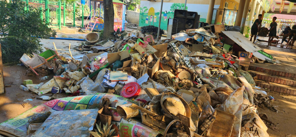 Những ngôi trường ngập sâu trong bùn, bàn ghế lấm lem, bếp ăn và nguồn nước sinh hoạt bị hư hỏng nặng.